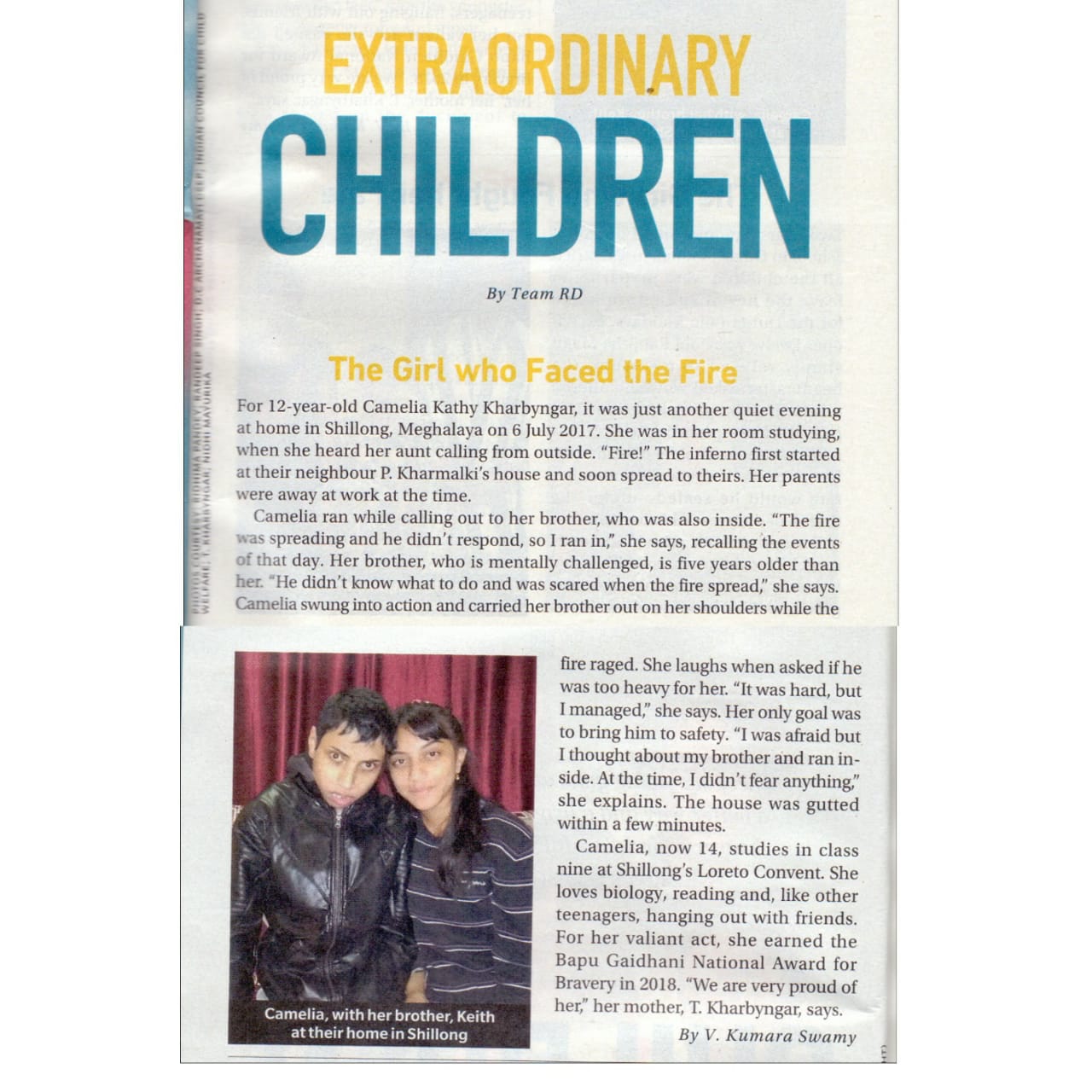 Description: Camelia C. Kharbyngar of class IX was awarded the Bapu Gaidhani National Award for Bravery in 2018 on account of her heroic act in rescuing her brother from the blazing fire which took place in her house.