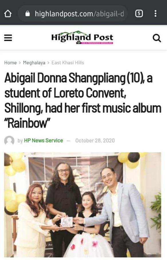 Description: Abigail Donna Shangpliang(10),a student of Loreto Convent,Shillong,had her first music album "Rainbow"released by Bryan Wallang,Principal of kiddies Corner,on October 24 at a private function.The album is a collection of Gospel and Disney song covers.Shangpliang is a member of the Aroha junior Choir.She twice secured distinction in the Music Theatre Examination conducted by the London School of Music and has won many award and titles for the music competitions.