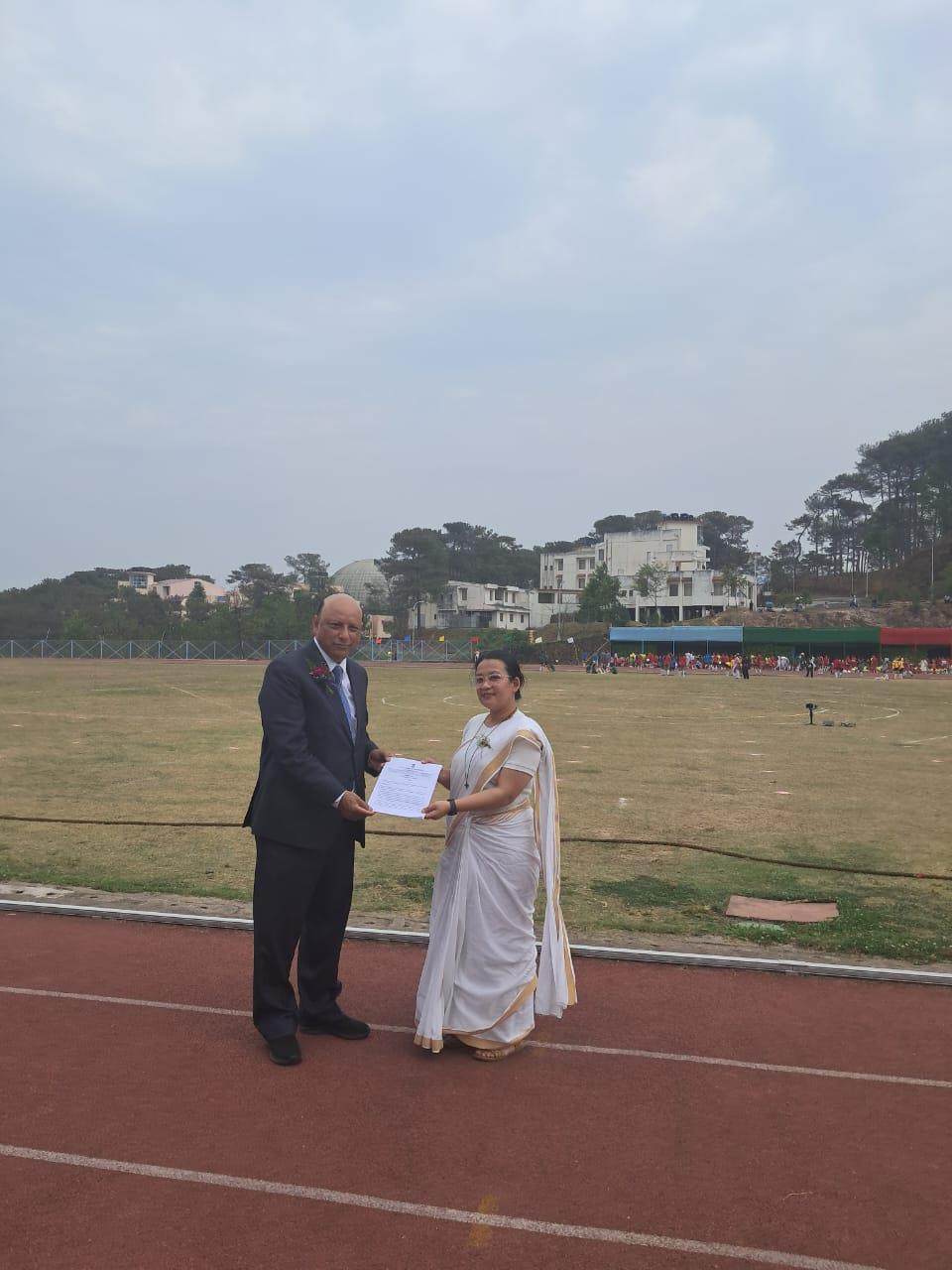 Description: Meghalaya State Olympic Association (MSOA) working President John F Kharshiing handed over a copy of the Meghalaya Sports Policy, 2019 to the Principal of Loreto Convent, Sister Mable Rudum at the Annual School Sports held on the 4th of April 2025. This Policy was given as a gesture to promote awareness and integration of Sports Policy among educational institutions in the state.