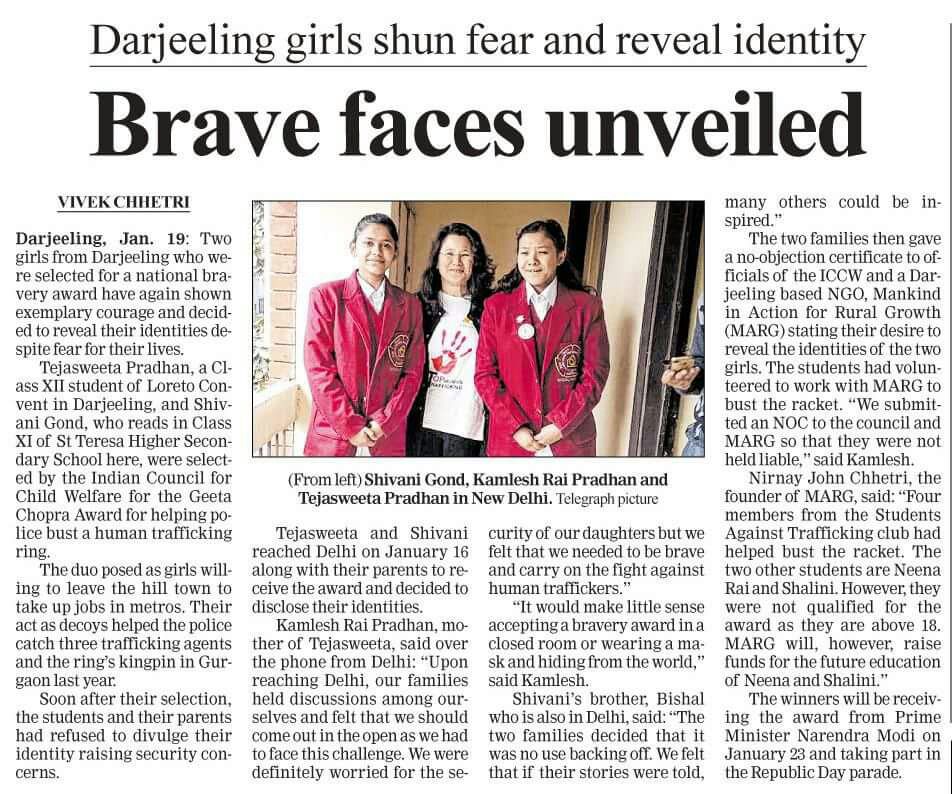 Description: With immense pride we would like to inform that one of our Loreto girls from Loreto Convent Darjeeling, Tejasweeta Pradhan of Class XII has received the prestigious 'Geeta Chopra National Bravery Award' from the Prime Minister on 23rd January 2017. She has also participated in the Republic Day parade in Delhi on 26th January 2017. Tejasweeta helped in the busting of a cross border flesh trade ring by posing as a trafficking decoy. She is truly a hero and we applaud her heroic feat. She exemplifies our foundress Mary Ward’s maxim, “ Be seekers of truth and doers of justice”. We celebrate her achievement and congratulate her for the courage of her conviction in ensuring justice. We would like to share this proud moment with all members of our Loreto family - parents, teachers and students.