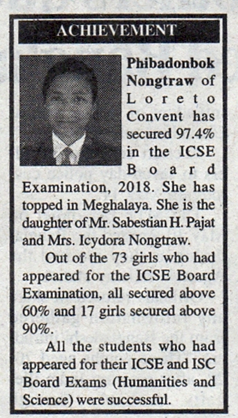 Description: Phibadonbok Nongtraw secured 97.4% in the ICSE Board Examinations 2018 and became the topper in Meghalaya. All the students who appeared for the ICSE & ISC exams were successful!